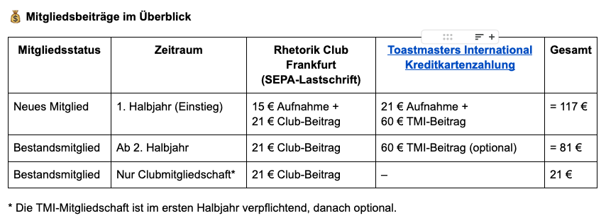 👉 Die bestehenden Mitglieder ohne Lastschriftmandat bitten wir, den Halbjahresbeitrag zeitnah selbst zu überweisen: Rhetorik-Club Frankfurt e.V., IBAN: DE03 8306 5408 0004 6569 62, Deutsche Skatbank.